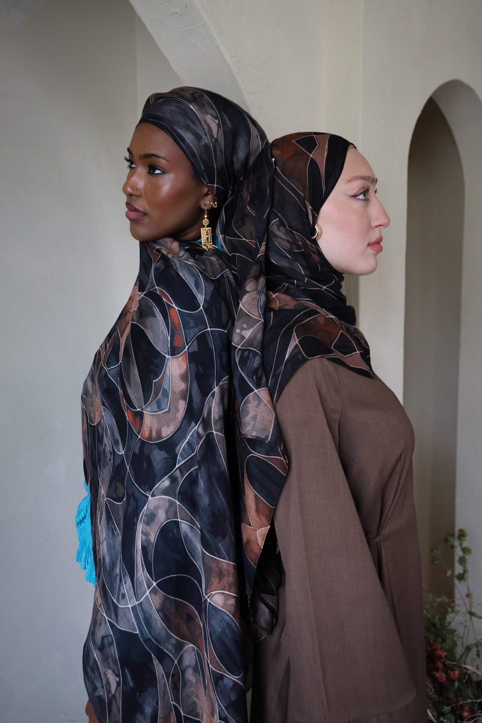 Mosaic Noor Modal Hijab is inspired by the glow of lanterns that illuminate Ramadan nights. With its black moody base tone, a gorgeous pops of beige and sand, its mosaic pattern echoes stained glass, where fragments of color catch the light against a dark backdrop. Made of soft, breathable modal fabric, this hijab is the perfect everyday hijab.