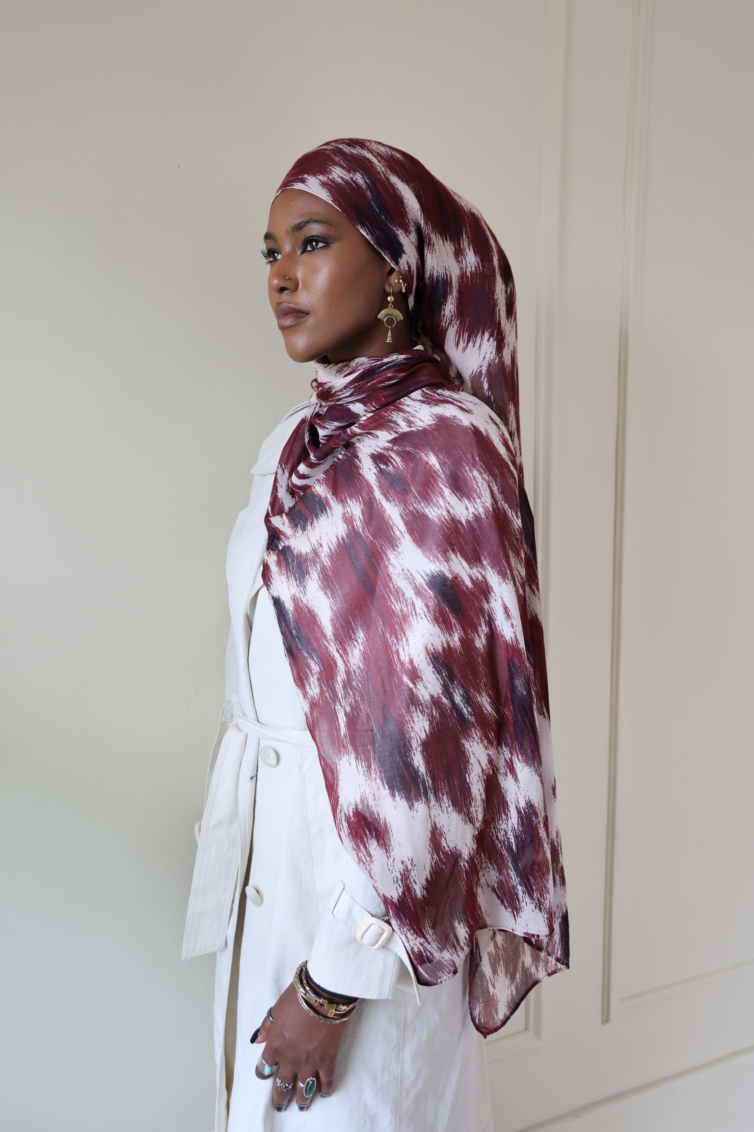Elevate your style with the My Fierce Pony Modal Hijab, featuring a rich burgundy and beige palette that evokes the graceful texture of pony hair. Crafted from soft modal fabric, this hijab offers a luxurious drape and vibrant deep fall colors, combining elegance with a touch of bold sophistication.