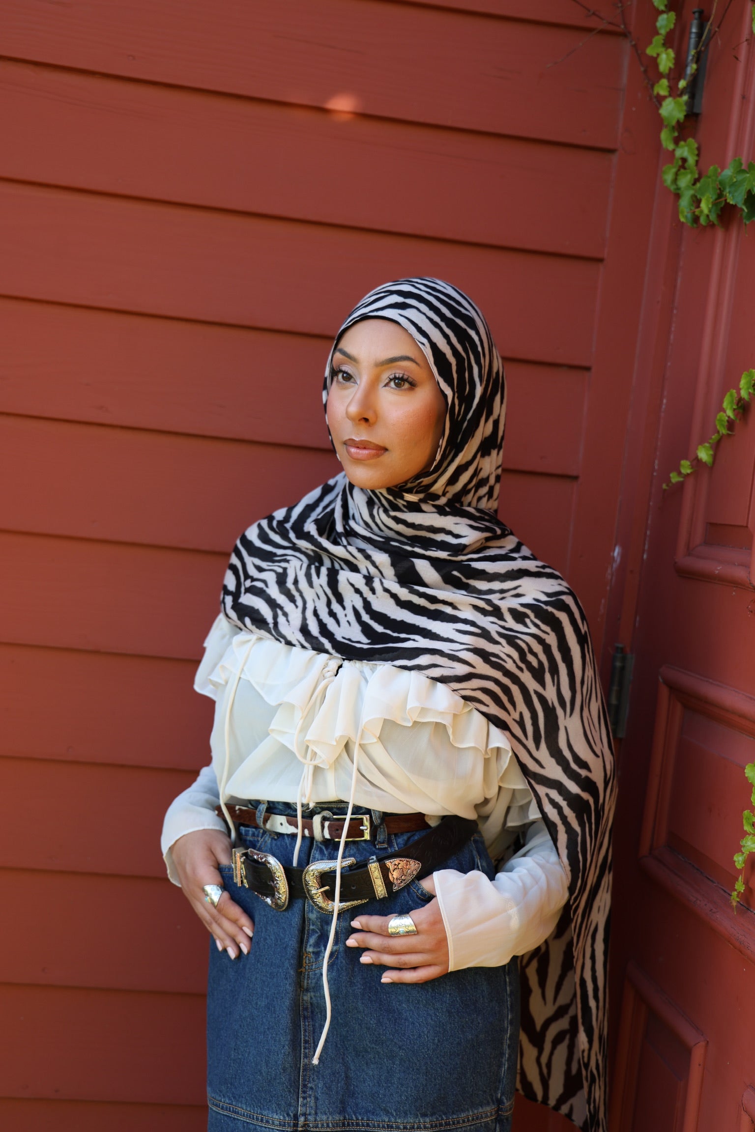 The Queen Zebra Modal Hijab features a striking black-and-white zebra print that embodies bold elegance. Crafted from soft modal fabric, it offers a comfortable, breathable fit perfect for all-day wear while adding a sophisticated edge to your look.